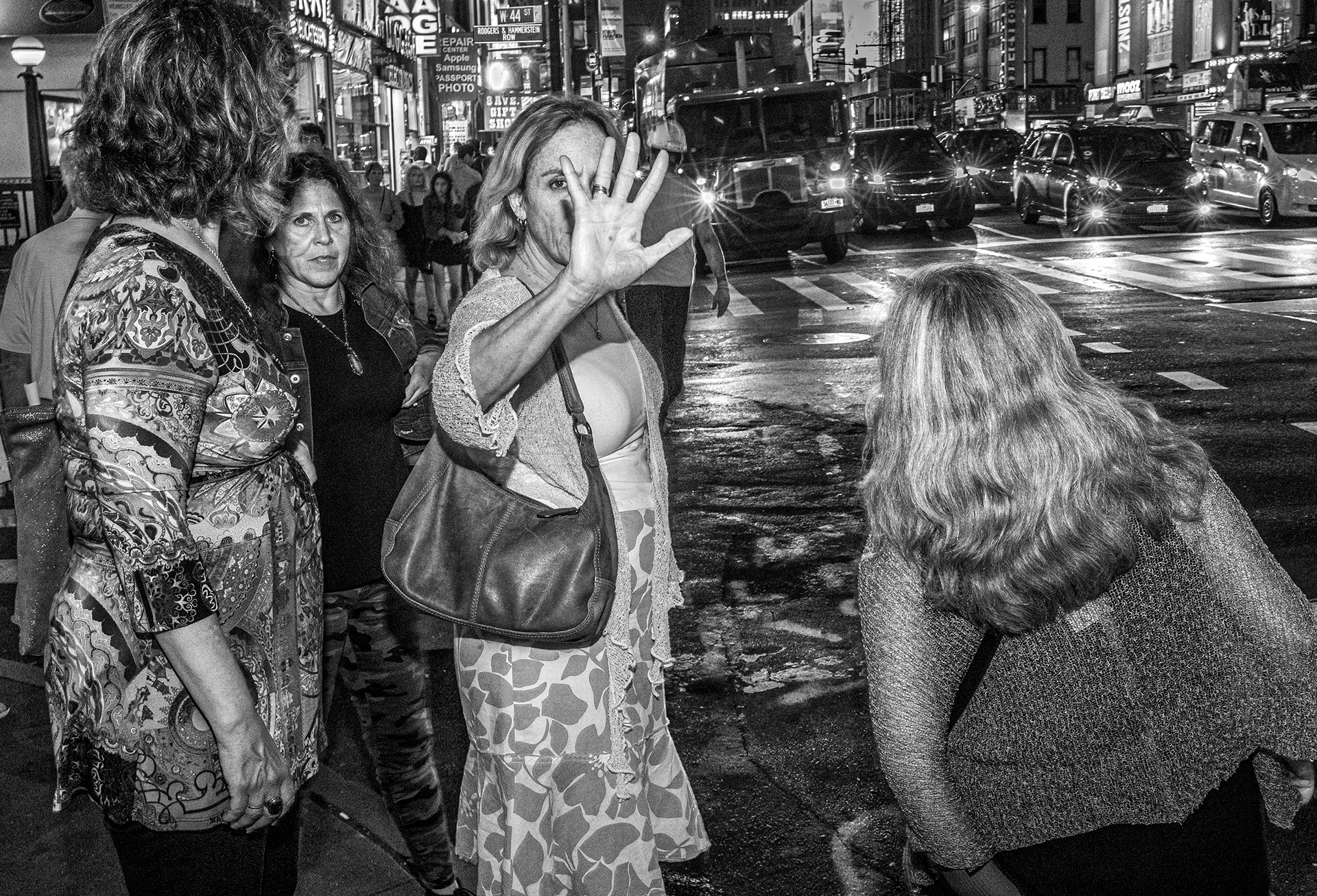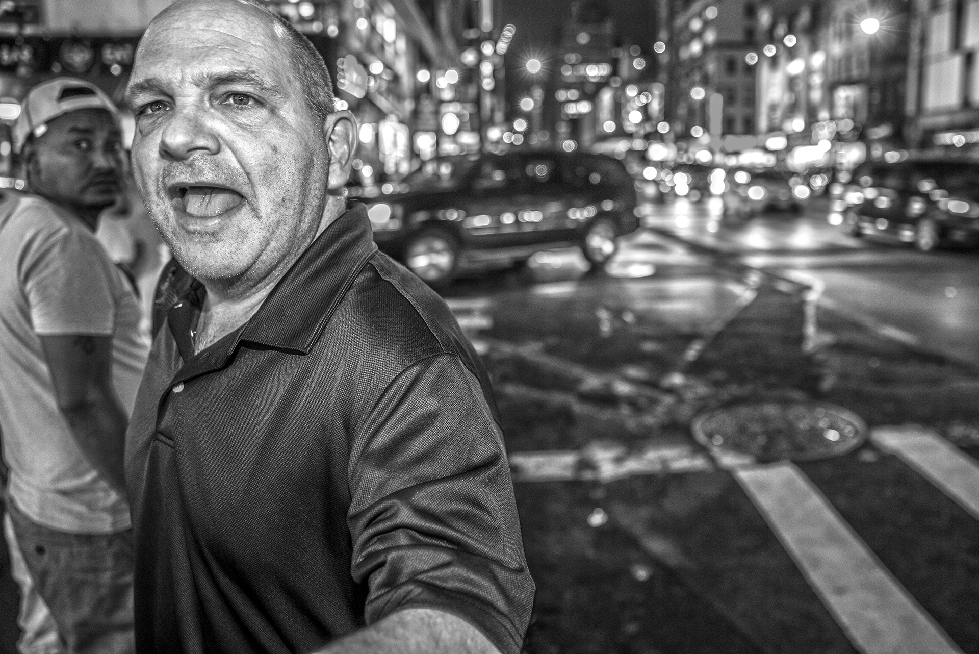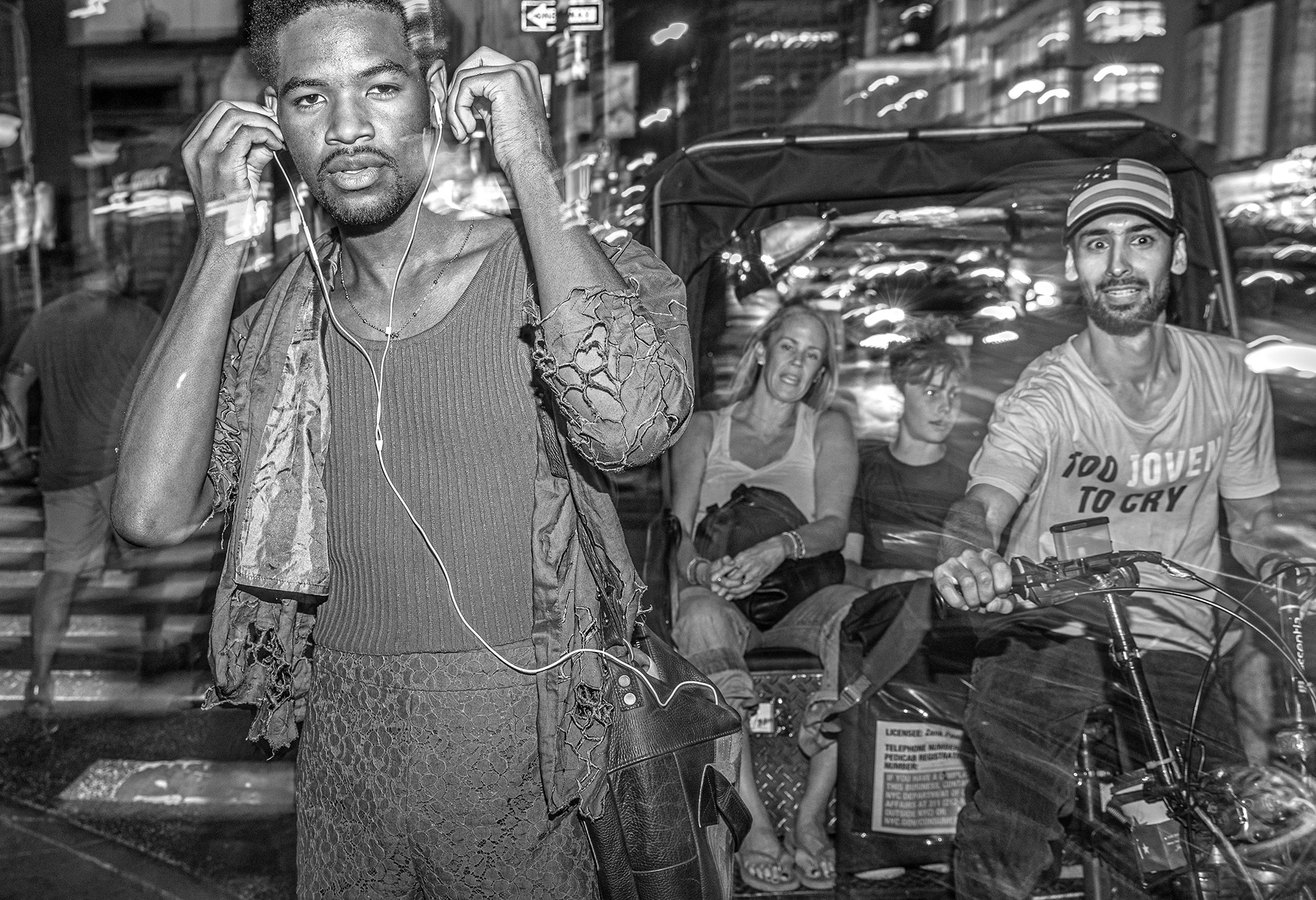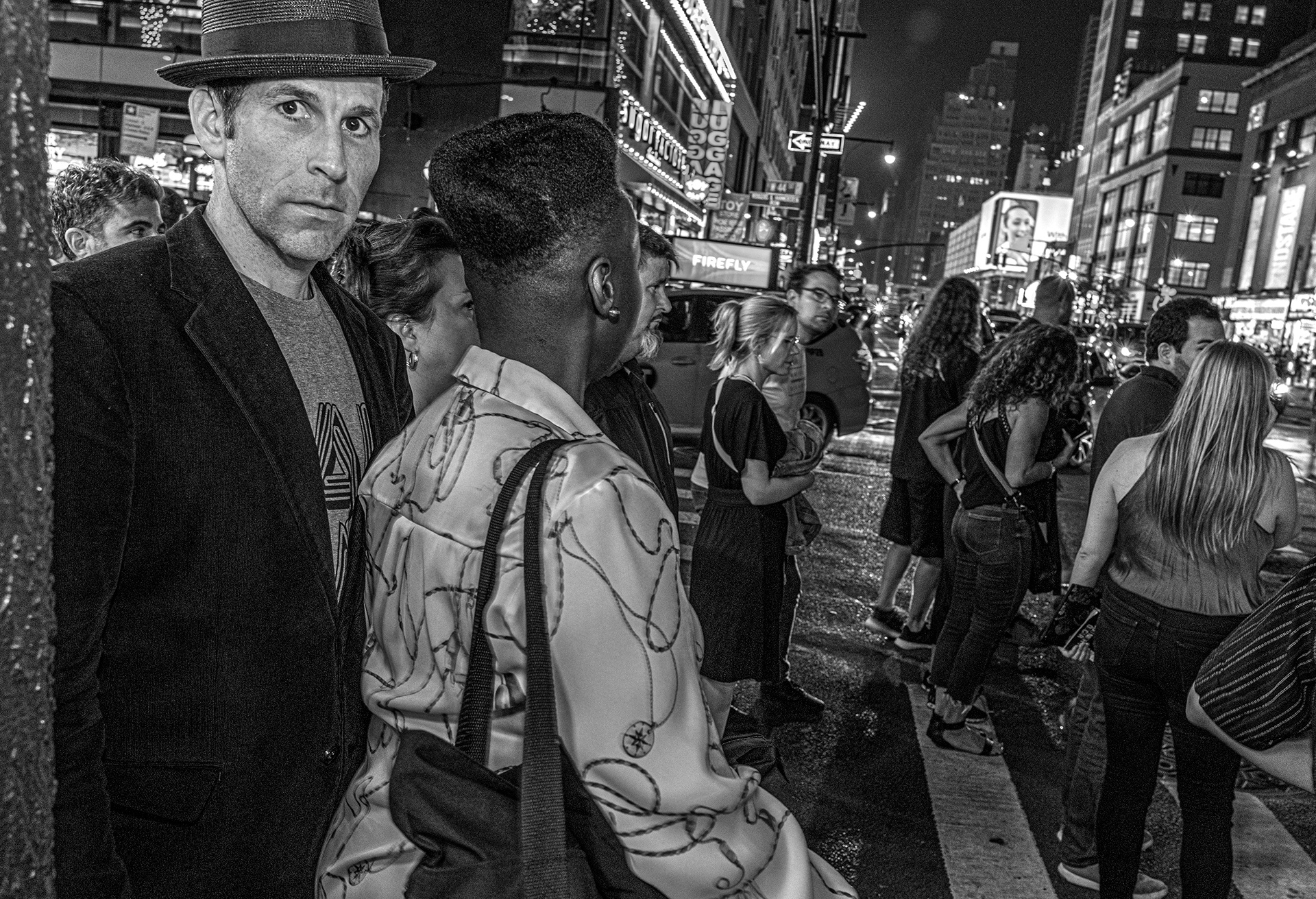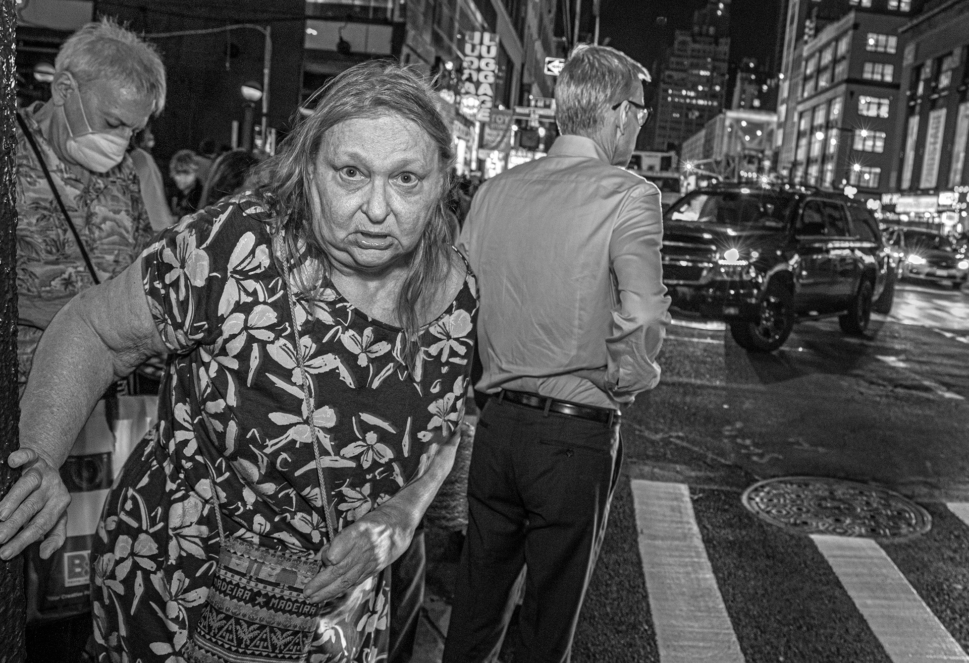 The streets of Manhattan are filled with people from all over the world. This gives me the opportunity to capture different cultures and faces on one street corner. I chose to shoot at night with a slow shutter speed to make the photographs more interesting. To prevent camera shake and to be removed from my subjects, I used a tripod and remote camera release. I placed my camera on the corner of 46th and 7th. As people crossed the street, I would click the remote shutter, and the flash would release. Using this technique, I was able to capture the reactions of people as they noticed the camera but no photographer.